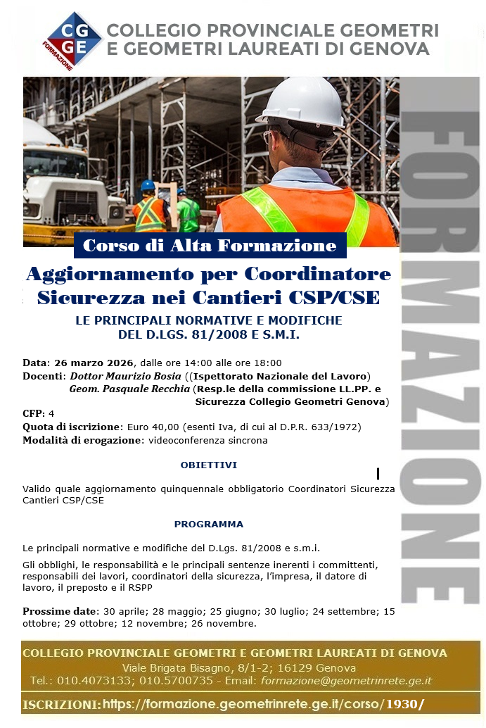 Formazione obbligatoria per coordinatori per la progettazione e per l’esecuzione dei lavori ai sensi del D.LGS. 81/2008 e S.M.I.
